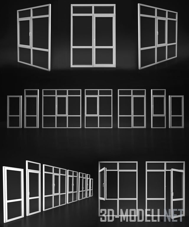 Линейка современных оконных блоков из белого металлопластика. В ассортименте: одностворчатая дверь с перемычкой, дверь с дополнительным остеклением сверху, трехсекционный балконный блок со створкой в центре, двухсеционный блок с одной створкой, двухсекционный блок с одностворчатой дверью, односекционный блок со створкой окна.