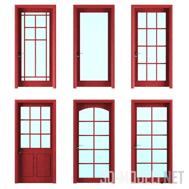 Шесть типов деревянных дверей со стеклянными панелями и деревянными перемычками. Размер двери 1 х 2, 2 м.