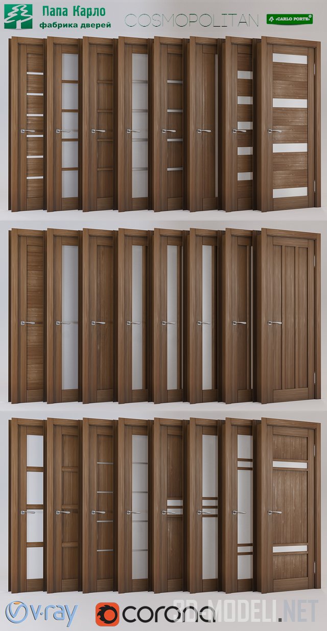 Набор разнообразных дверей серии Cosmopolitan от производителя Папа Карло. Двери для современного интерьера, в вариантах глухих створок и с различными вставками из матового стекла.