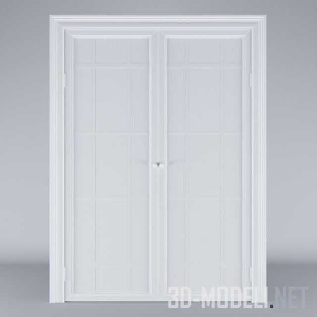Широкие интерьерные (межкомнатные) двери в английском стиле. Полотна с матовым белым стеклом до пола, пересеченным вертикальными и горизонтальными рейками темного цвета в тон наличникам.