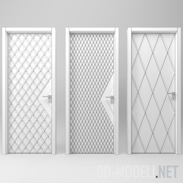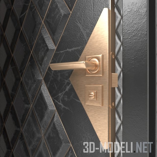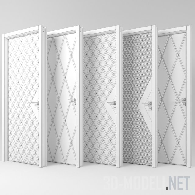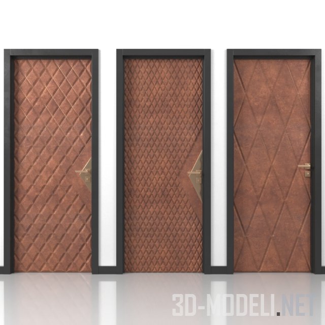 Пять вариантов входных металлических дверей. Накладки на полотнах двери выполнены в одном стиле и представляют плоскость с диагональными фасками. Фаски формируют ромбы, напоминающие каретную стяжку. Использование разных размеры ромбов и вариации материала отделки (представлены белый, рыжий, шоколадный и какао) позволяют подобрать дверь на свой вкус. На некоторых моделях золотистым треугольником выделена зона замка и ручки, что привносит дополнительный декоративный эффект.