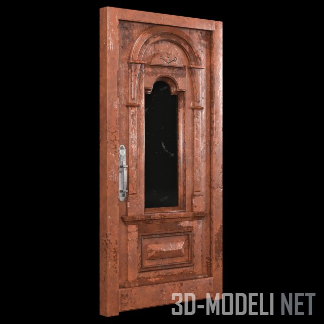 массивная деревянная состаренная дверь цвета мокко. Полотно с потертостями, дополнено массивной дверной ручкой. В двери вставлено темное стекло арочной формы.
