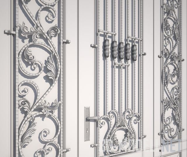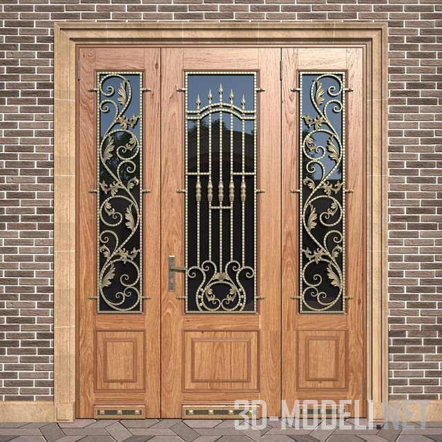 Входная трехстворчатая дверь из массива дуба светло-коричневого цвета с художественной ковкой, в классическом стиле. В архиве два варианта дверей для проемов шириной 230 см и высотой 300 и 240 см.
