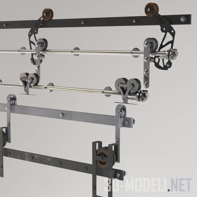 Пять вариантов подвесных раздвижных дверей с верхним рельсом. Представлены разные варианты полотен дверей: скомбинированы элементы разного цвета и фактуры из разных пород дерева. Планки в панели уложены разными способами. В некоторых вариантах добавлены элементы ковки, крупные заклепки и интегрированы стекла.