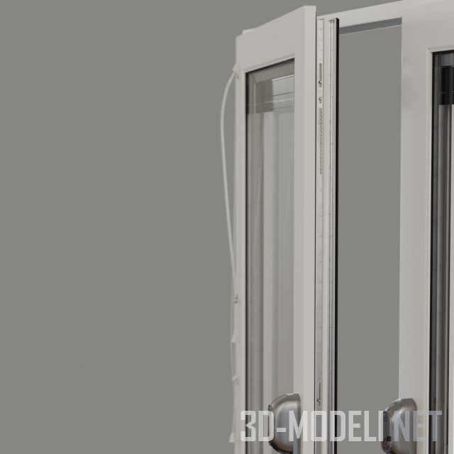 Двустворчатое металлопластиковое окно белого цвета с металлической фурнитурой. Одна створка окна слегка приоткрыта.