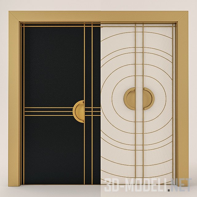 Для формирования элегантного пространства в стиле арт-деко хорошо подойдут такого плана межкомнатные двери. Золотистого цвета коробка каждой модели идеально сочетается с черным или белым цветом полотна. Оригинальные ручки и декор полотна соответствует отделке коробки.