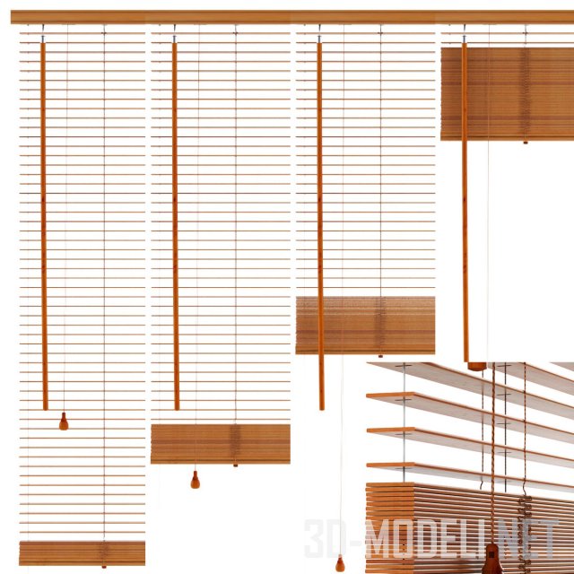 Выполненные из деревянных ламелей жалюзи на окна. Древесина тонирована светло-коричневым сатиновым лаком. Штанга управления наклоном ламелей тоже изготовлена из дерева. Представлены жалюзи в разных степенях раскрытости.