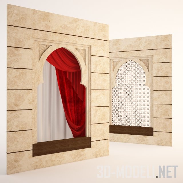 Характерное для арабской архитектуры арочное окно. Представлено два варианта: с витиеватой решеткой и тяжелыми шторами из белой и красной ткани. Проем окна сформирован заостренной аркой и небольшими «плечами». Силуэт проема напоминает мусульманские храмы с заостренным куполом. Лаконичный барельеф, высеченный на стене из бежевого камня обрамляет проем окна и дополняет декоративный эффект.