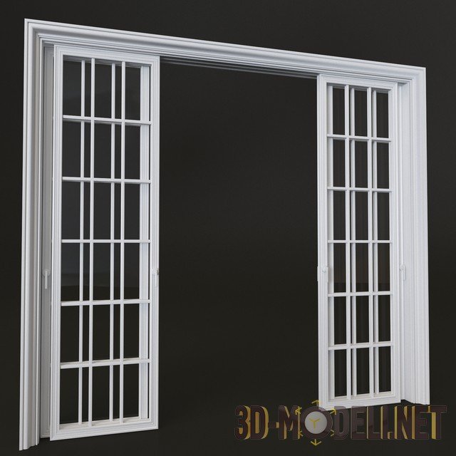 3D модель раздвижной двери, стиль которой - неоклассика. Белый цвет идеально подходит для такой конструкции двери, а четыре створки предусматривают удобство и красивый внешний вид.