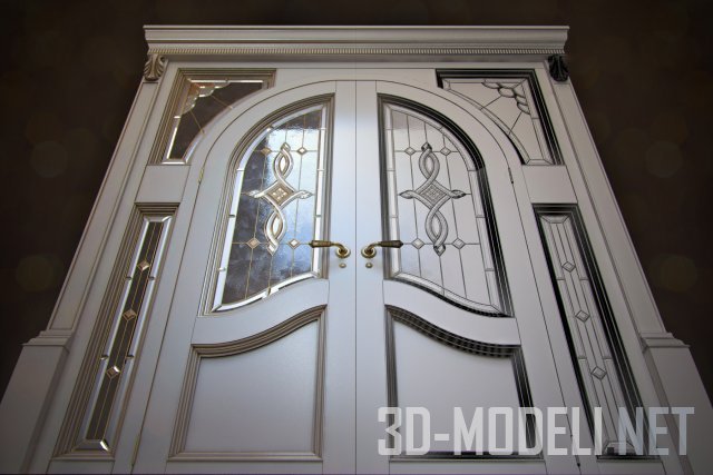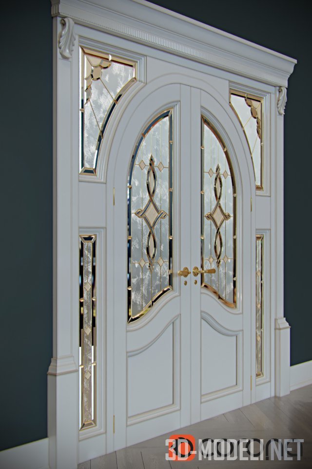 Роскошный двухстворчатый дверной блок с арочными створками в прямоугольном проеме и стационарными вставками по бокам. Художественный витраж с золотистыми перемычками гармонично интегрирован в полотна и вставки. В сочетании с белыми поверхностями и лаконичной барочной резьбой на наличниках, венце и филенках создает гармоничный ансамбль в классическом стиле.