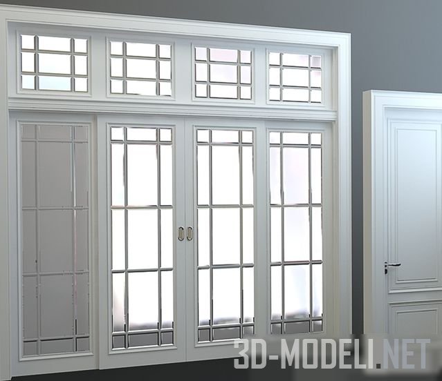 Пара дверных блоков: четырехсекционная, двухстворчатая парадная дверь со шпросами в стеклянных вставках и межкомнатная в классическом стиле. Деревянные элементы выкрашены в белый цвет. Стекла на парадной двери матовые, с полированным фацетом. Высота большого (парадная дверь) блока 2,7 м. Межкомнатная дверь 2,2 м.