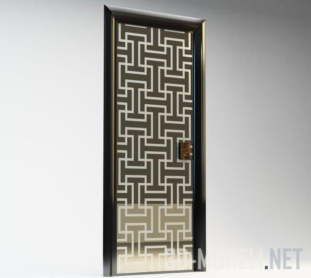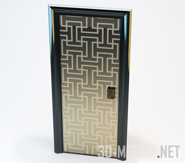 Современная межкомнатная дверь Ianus от Longhi с полотном из каленого стекла. На стекло нанесен геометрический орнамент (паттерн). Наличники - массив дерева. Прямоугольная ручка выполнена из мрамора.