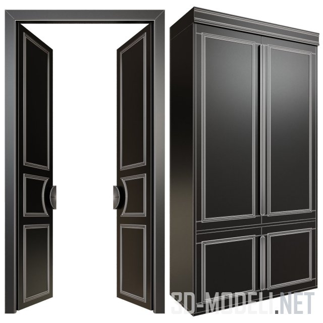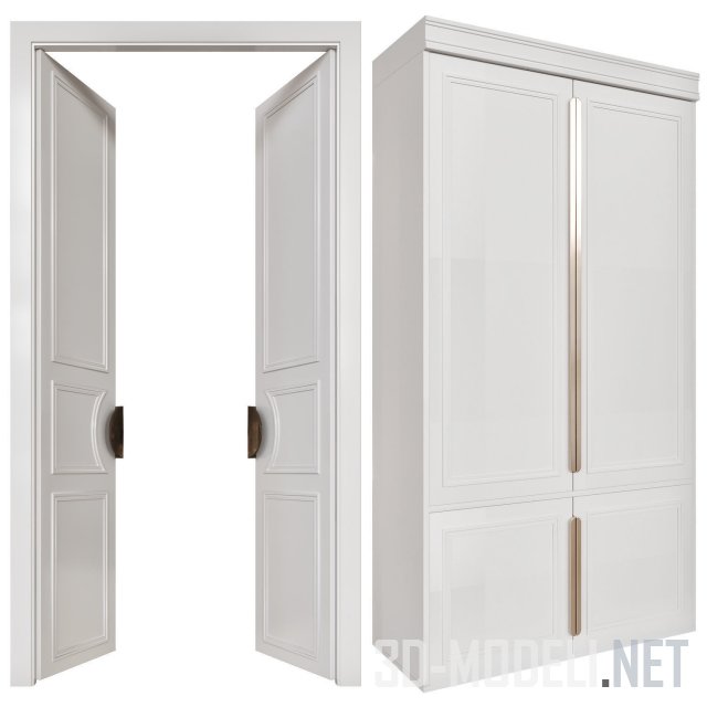 Классические двери белого цвета, два варианта полотна. Декорированы в соответствии со стилем.