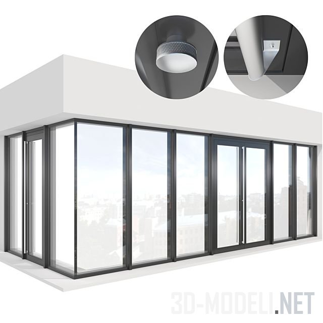 Актуальный набор элементов остекления (на основе дверных систем Schuco ADS 70 + FWS 50), нужный вариант для экстерьерных проектов. Все элементы собираются в единую ленту остекления.
