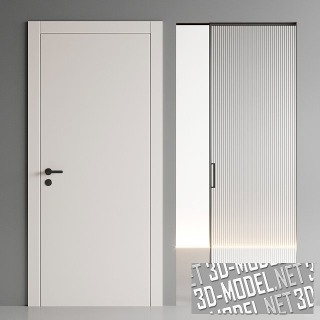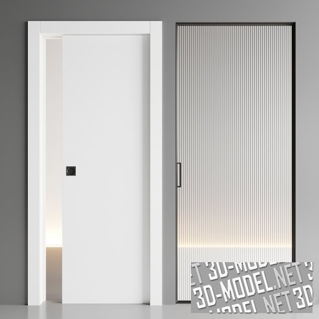 Современные межкомнатные двери от Garofoli в трех вариантах. Первый вариант: стандартные минималистичные двери с глухим полотном и наличниками цвета слоновой кости и черной ручкой. Второй вариант: белые двери с глухим сдвижным полотном и врезной черной ручкой. Третий вариант: двери со скрытым коробом и сдвижным полотном из прозрачного сотового поликарбоната в тонком металлическом профиле.