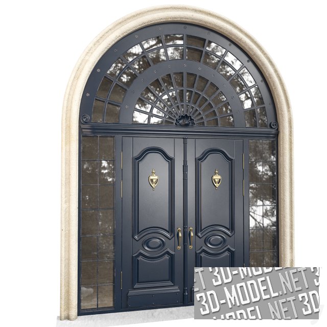 Двухстворчатая дверь с арочным венцом в большом арочном проеме. Арка проема обрамлена широким лепным фризом песочного цвета. Справа и слева от двух черных филенчатых створок обустроены стеклянные вставки с тонкими черными шпросами. Верхняя, полукруглая часть арочного проема заполнена остеклением с декоративными перемычками в виде лучей и концентрических полукругов и декоративной клепкой в широких элементах. В точке выхода лучей установлен декоративный цветок. Ручки на дверях, петли и декоративные колотушки золотистые.
