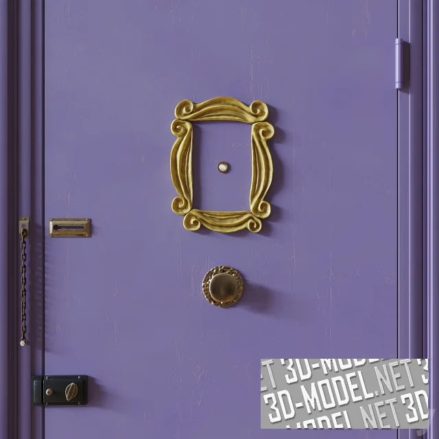 Деревянная входная дверь с фрамугой из Американского ситкома «Friends». Дверь выкрашена в сиреневый цвет изнутри помещения и в темно-зеленый цвет снаружи. Изнутри дверной глазок декорирован золотистой фигурной рамкой. Снаружи на полотне двери смонтированы латунные цифры «20». Под ней - механический дверной замок. На внутренней плоскости смонтированы замок и цепочка. Ручка с замком бледно-золотистые.