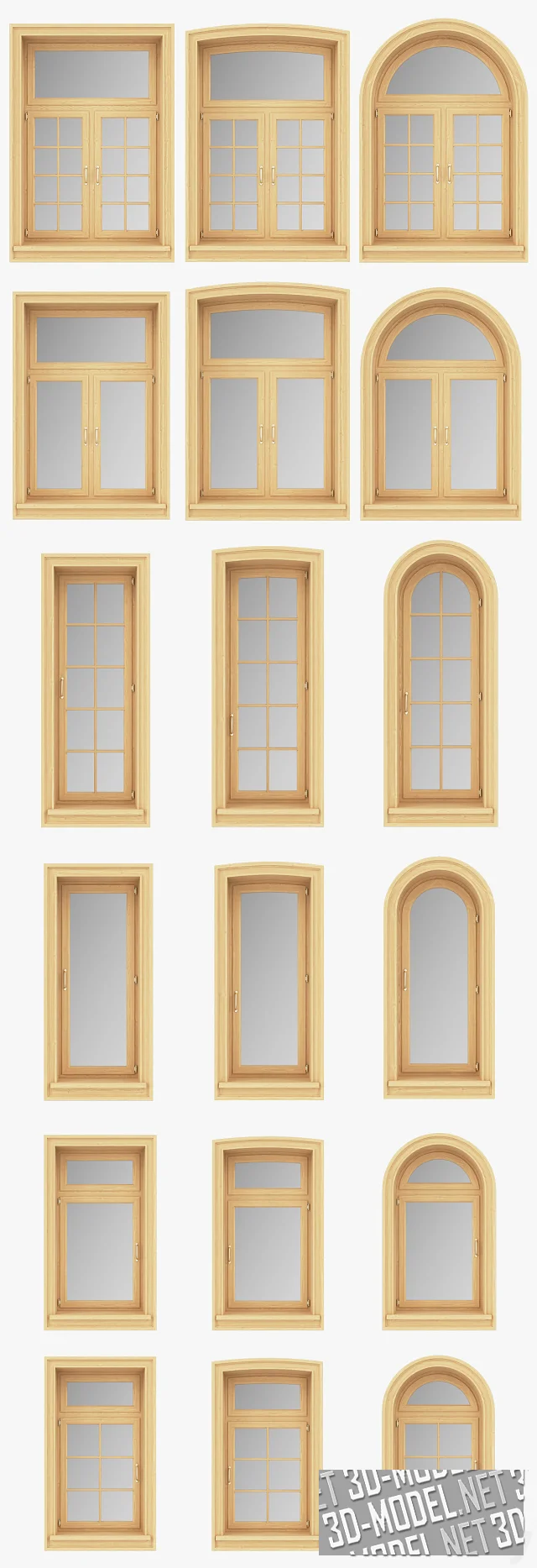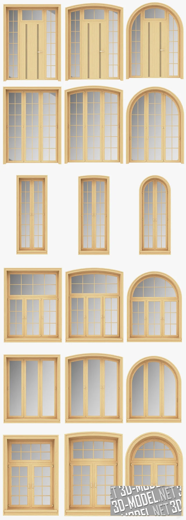 Набор деревянных окон, представленных в 6 цветовых вариантах, 4 видах наличников, 2 арочных видах и входные двери. Детализированная трехмерная модель подойдет для многих реалистичных проектов, в том числе для крупных планов и 4К рендеров. Настроенные материалы Vray, Corona и текстуры в архиве.
