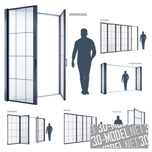 Коллекция стеклянных окон-дверей с металлической рамой. Представлены варианты с поворотным, складным и раздвижным механизмом.