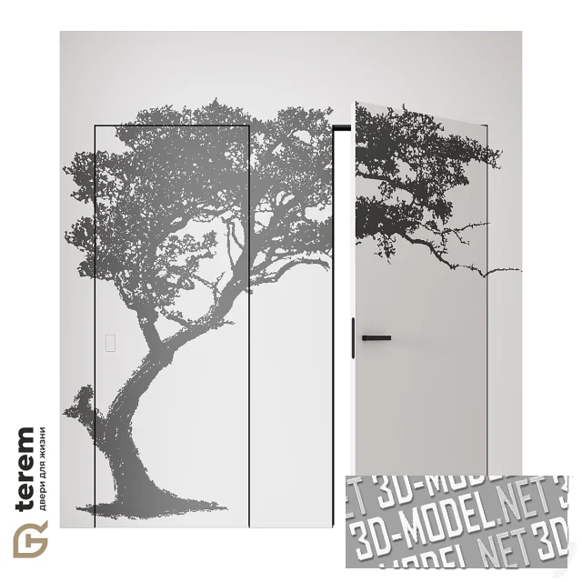 Современные межкомнатные двери скрытого монтажа от фабрики Terem. Гладкие глухие полотна монтируются на скрытые петли в скрытой алюминиевой коробке. Модели представлены в парном исполнении (два полотна размещены на одной стенке), с черной минималистичной и скрытой белой ручкой. Для примера общая плоскость стены и полотен декорирована принтом (в двух вариантах: черно-белое дерево и пасторальный акварельный рисунок с растениями, насекомыми и птицами). Габарит полотна: 210х80см.