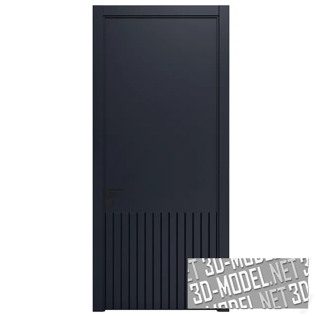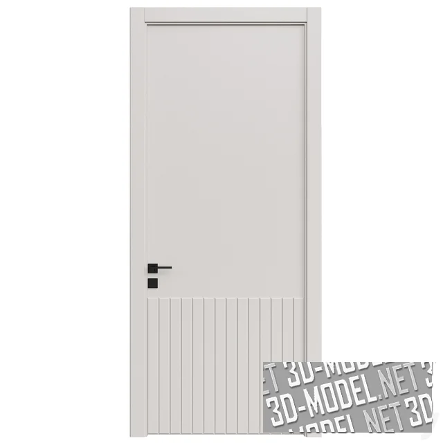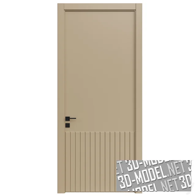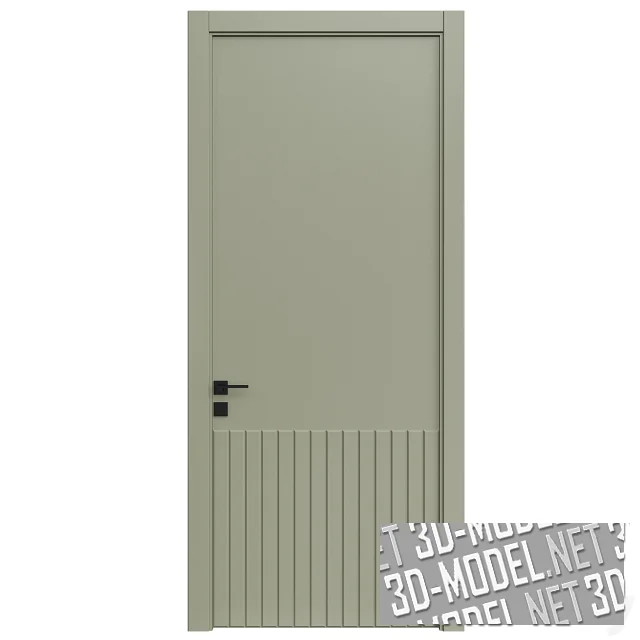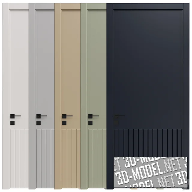 Минималистичные современные межкомнатные двери в пяти цветах: белом, светло-сером, охристом, светло-оливковом, черном. Полотно декорировано вертикальными рельефными планками на нижней трети двери. Ручки и накладки на замках - минималистичные, квадратные. Цвет черный, отделка матовая. Наличники прямые, с тонкой выбранной четвертью по внутренней кромке.