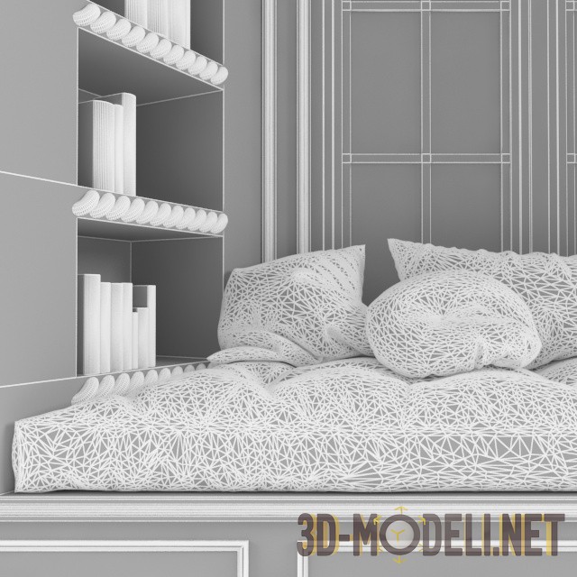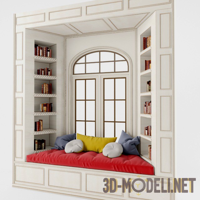 3D модель классического арочного окна, в конструкции которого оборудованы полки с книгами, а также предусмотрено мягкое сиденье с декоративными подушками. В результате получилось идеальное окно-библиотека, которое очень украсит интерьер, придав ему уют и своеобразность. Файл сохранен в формате 3ds max 2012, 2015 и fbx, материалы Vray.