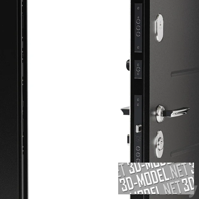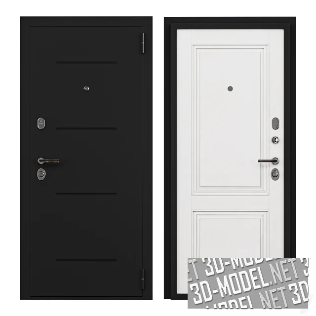 Входная металлическая дверь с деревянной белой внутренней филенчатой накладкой в стиле нео-классика - модель PORTA S 104.К32 BIANCO VERALINGA. Мощная стальная дверная коробка и полотно двери - черного цвета. Наружная плоскость полотна декорирована четырьмя горизонтальными канавками со скругленным профилем. Фурнитура (замки, ручки, петли, дверной глазок) - хромированные. Габарит двери: 96х205х92см.