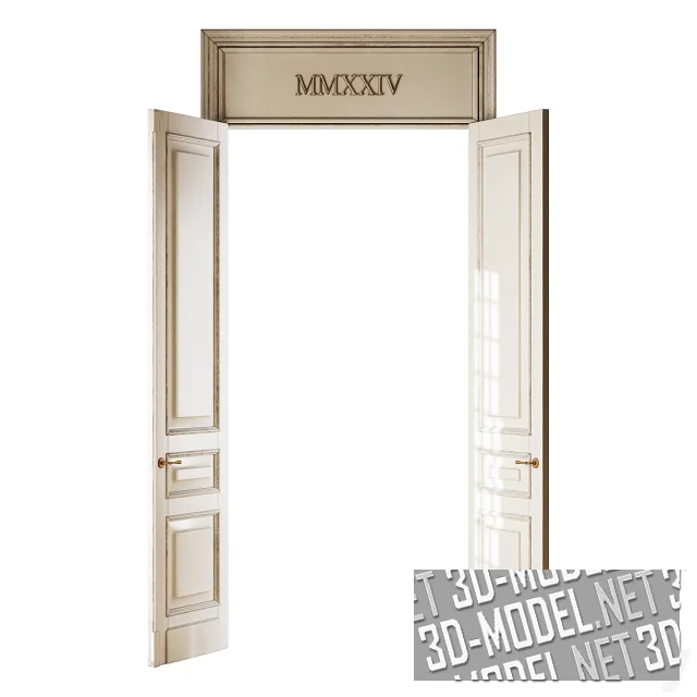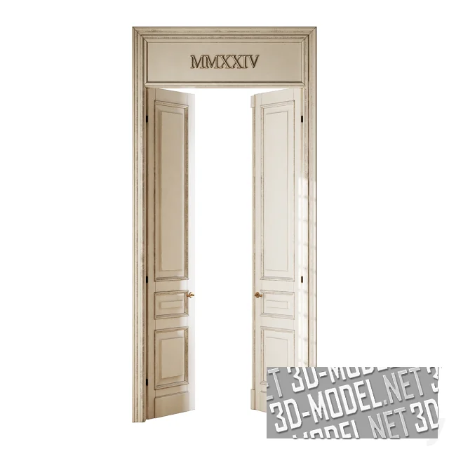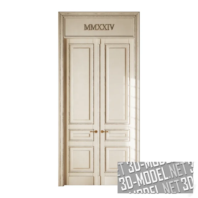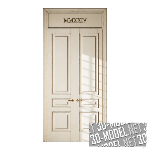 Высокая двухстворчатая дверь в классическом стиле, с фрамугой и барельефом MMXXIV (2224) на ней. Полотна и горизонтальную верхнюю панель украшают филенки. Цвет полотен и наличников - слоновая кость. В сочетании с патинированием рельефов профилей и золотистыми ручками в ретро стиле, создается элегантный объект для интерьера в классическом стиле или в стиле ампир.
