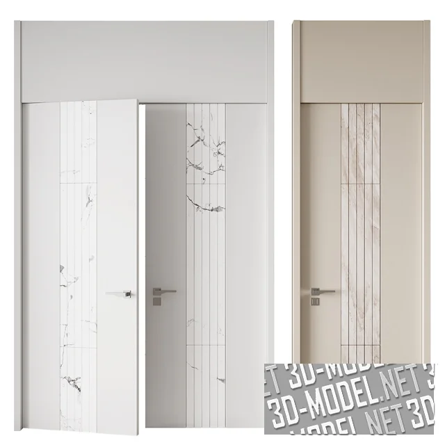 Современные дверные полотна выполнены в минималистичной стилистике и сочетают гладкие однотонные поверхности с декоративными вертикальными вставками под камень или древесину. Контраст фактур делает двери выразительными, но при этом они остаются спокойными и универсальными. Первая модель оформлена в холодном белом тоне с имитацией мрамора и тонкими прорезями, вторая в теплой бежевой гамме с деревянными акцентами. Высокая притолока визуально вытягивает проем, создавая ощущение архитектурной цельности. Такие двери подойдут для современных интерьеров, где важны чистые линии и аккуратные декоративные приемы – от квартир в минималистичном стиле до коммерческих пространств.