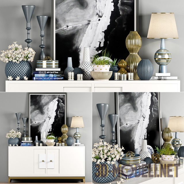 Набор декоративных элементов для украшения интерьера. Цветовая гамма предметов позволяет использовать аксессуары вместе или порознь, в интерьерах с серо-синей гаммой, с легким налетом классики и арт-деко. Предметы располагаются на белом креденсе с маленькими золотистыми ручками на фасадах, декорированных прямоугольными объёмными элементами. Точеные графитовые подсвечники, серо-синяя шаровидная ваза, напоминающая фрукт с карвингом. В вазе букет мелких белых цветов. Небольшая стопка книг в синих тонах с круглой коробкой сверху. Несколько ажурных декоративных бутылок и стаканчиков, цветочный горшок с кустиком зефирантеса, белая с синим орнаментом тарелка. Настольный светильник с классическим тканевым абажуром молочного цвета, на оригинальной стойке с шаровидным утолщением. На заднем плане крупная абстрактная черно-белая картина.