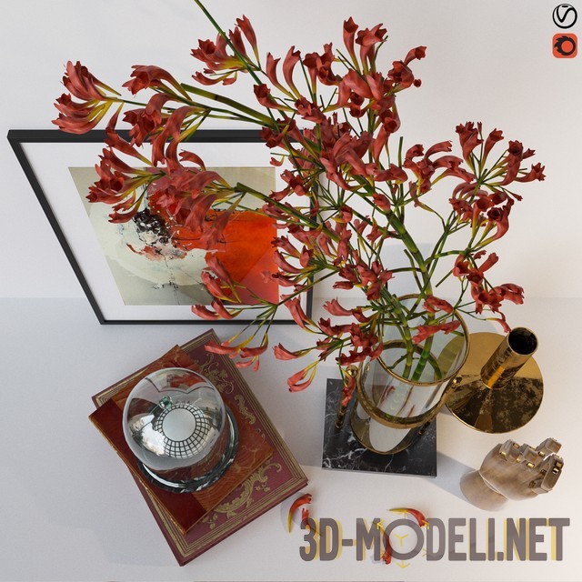 Декоративный набор в осеннем стиле. В инсталляции представлены две рыже-коричневых книги с золотым тиснением на корешках, на которых стоит стеклянная колба, небольшая абстрактная картина, преимущественно в бежево-красном цвете, высокая цилиндрическая стеклянная ваза с бронзовой отделкой. В вазе стоят красные гладиолусы. Бронзовая ваза золотистого цвета и несколько опавших цветков на столе дополняют осеннее впечатление.