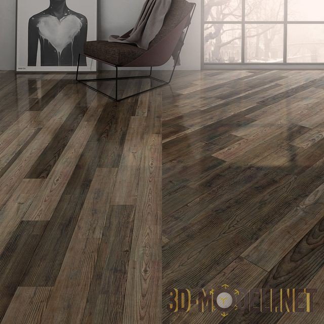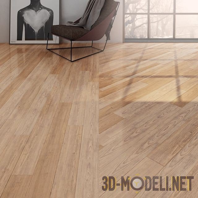 Три вида напольного покрытия в формате стандартных ламелей, характерных для паркетной доски. Для каждого вида показаны по два варианта укладки, прямой и по диагонали (под 45 и 90 градусов). Даны три варианта цвета древесины с явно выраженной текстурой: светлый бежевый, светло-серый и темный. Размер полотна паркета: 5 х 5 м, размер одной планки: 120 х 1200 мм.