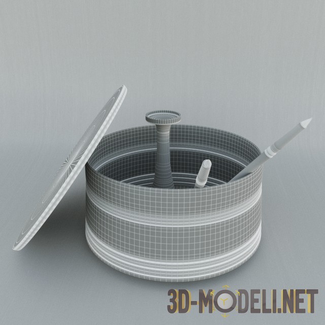 Декоративное наполнение для рабочего или косметического столика в ретро-стиле. Круглая коробка с тонкими металлическими обручами на бортах, сделана будто несколько столетий назад, поскольку борта и крышка коробки искусно состарены. В коробке находится пара художественных кистей и стеклянная колба.