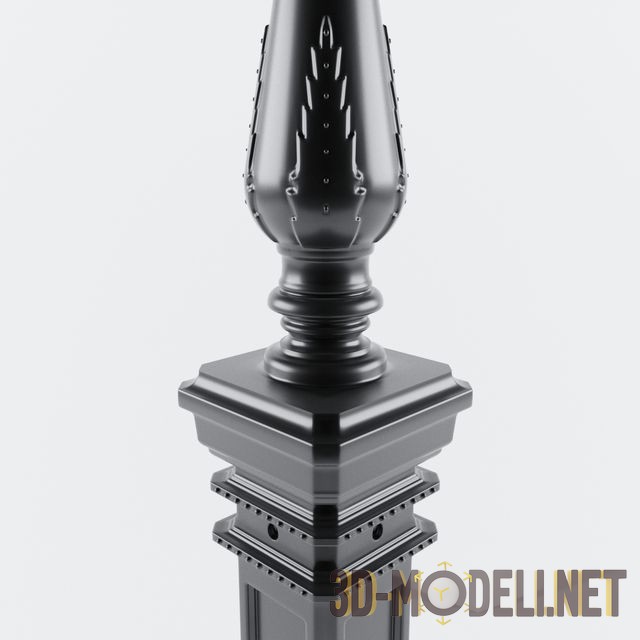 Металлическая литая, черная, четырёхгранная, с множеством филёнок и фигурной вставкой, колонна для использования в интерьерах в стиле лофт или ретро. Подобные колонны часто использовались в девятнадцатом и начале двадцатого века.