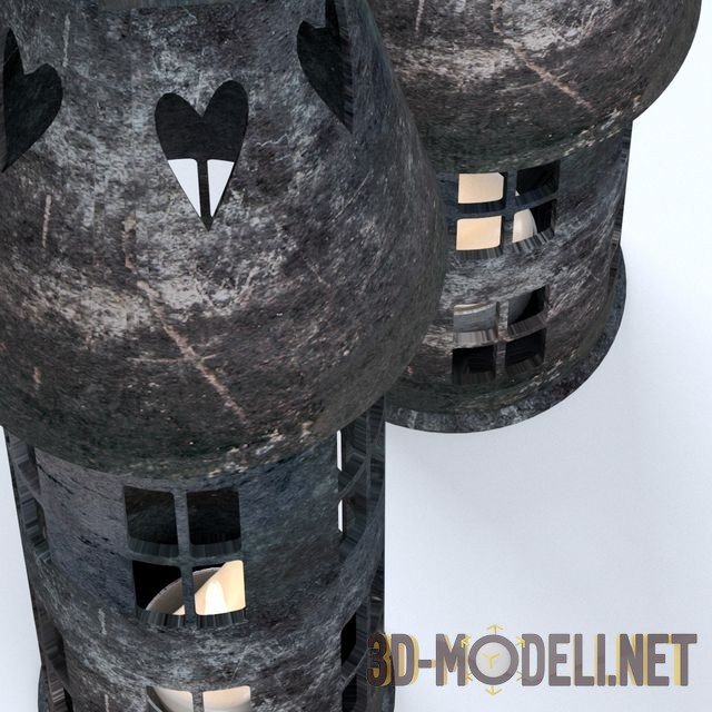 Подсвечник в виде старинных башен с конусообразными крышами и двумя уровнями высоких окошек с крестовинами перемычек. В плоскости крыш пробиты отверстия в виде сердечек. К верхушкам прикреплены скобы для подвешивания и переноски фонарей. Рустикальная поверхность имитирует обожжённую. Внутри фонарей размещаются невысокие толстые свечки.