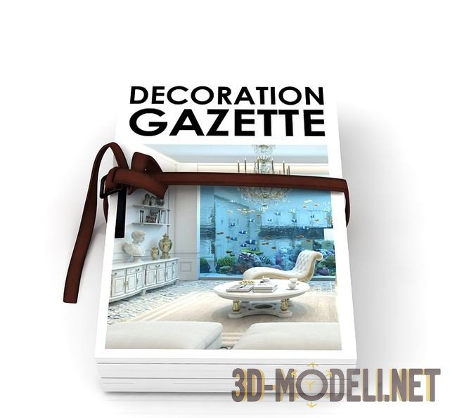 Стопка многостраничных журналов, связанных коричневым кожаным ремнём. На обложке верхнего журнала визуализация роскошного белого интерьера с большим морским аквариумом во всю стену.