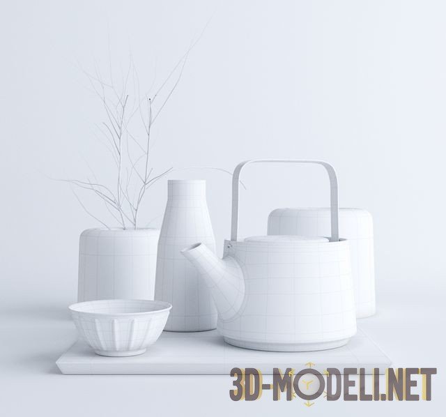 Набор аксессуаров для создания декоративных акцентов на кухне или в другом помещении. Основой композиции является черный чайник, который разработала дизайнер Anna Lerinder. В ее исполнении также представлены большая бутылка для натюрморта и мелкая, окрашенная фарфоровая миска. Вазы от Studio Twocan органично дополняют комплект.