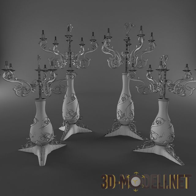 Несколько больших канделябров в стиле арт–деко. Подсвечники на пять свечей выполнены из металла. Трёхногая подставка служит базой для кувшиноподобной ноги. К центральной оси приварены пять ажурных завитков, являющихся консолями для свечей. Четыре варианта подсвечников декорированы разными способами: чёрный с золотом, золотой, чёрный и расписанный мелким орнаментом по белой эмали.
