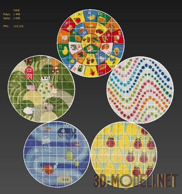 Яркий комплект современных круглых ковриков для декора детской комнаты. Любой из представленных вариантов позволит создать в комнате веселую и живую атмосферу. В наборе следующие ковры: Lady Bug Yellow Area от DwellStudio, Amelia Ivory Multi Wave, Momeni 'Lil Mo Ocean Life Blue, Momeni Lil' Mo Whimsy LMJ-11 5', Educational Rug ABC Food Fruit, Letters kids School Time. Размеры любого ковра: 3,0 x 3,0.