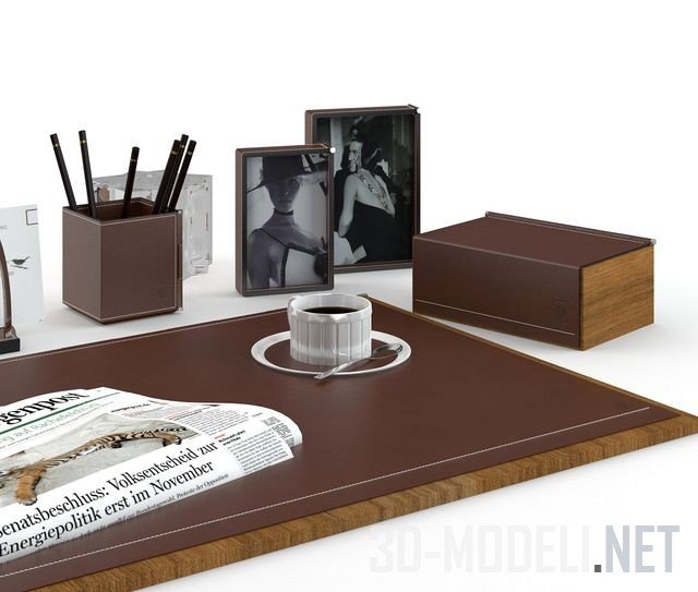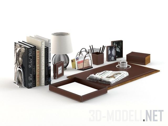 Настольные принадлежности от Ralph Lauren, хорошо подойдут в классический интерьер кабинета. В комплекте несколько книг, прижатых хромированными подставками, настольный светильник с шаровидной ногой и цилиндрическим тканевым белым абажуром, настольные часики, органайзер, фоторамки, шкатулка, пресс–папье, лоток для бумаги, а также доска с газетой и чашкой кофе. Несколько предметов объединены общей стилистикой, материалами (простроченной белыми нитками коричневой кожей) и техникой отделки.