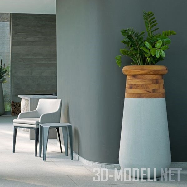 Высокие цветочные горшки из легкого литого бетона с деревянной или пробковой верхней частью. Аксессуар обладает массой достоинств: горшок может быть из цветного бетона с деревянной или пробивной пропиткой, причем цвет варьируется по запросу заказчика, а также он достаточно устойчив и, что немаловажно для современной экологии, биоразлагаем. Будет хорошо смотреться с крупными домашними растениями типа замиокулькаса, а также в садовом ландшафтном интерьере.