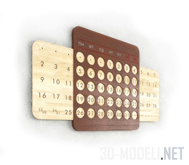 Функциональный интерьерный аксессуар, «Вечный календарь», изготовлен из двух деревянных пластин с разной тонировкой. На прямоугольной, светлой пластине нанесены цифры в пять горизонтальных рядов. На второй, тонированной под орех, нанесена круглая перфорация в пять рядов и названия дней недели. Две панели сдвигаются особым образом друг относительно друга, создавая при этом определенную комбинацию цифр в круглых окошках верхней пластины. Углы элементов скруглены. Календарь может служить как декоративным элементом интерьера, так и практической деталью на рабочем столе. Размеры: 600 х 400 х 16 мм.