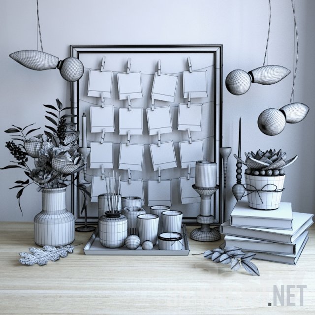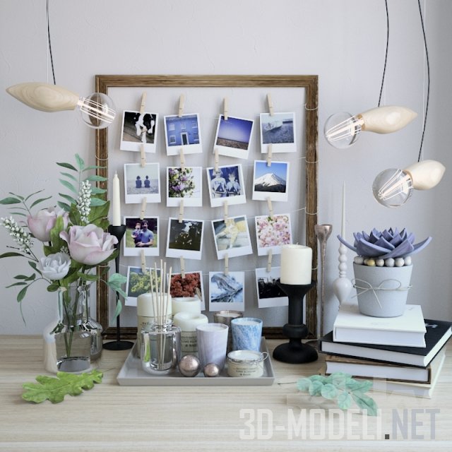 Современный набор декоративных элементов для интерьера. В комплекте оригинальные подвесные светильники, небольшой букетик, книги, свечи, фотографии и пр. Качественная и детальная, фотореалистичная модель.