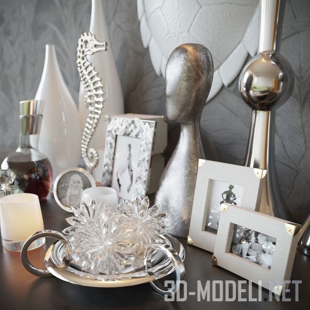 Набор декора в современный интерьер. Композиция собрана из белых, серебристых и золотисто-платиновых элементов. В центре композиции – белый панцирь морской черепахи и золотистая металлическая фигурка морского конька. Две пары ваз: Aurora и Clarion, несколько фоторамок: Picture Frame Chatwin, Lucia Frame и из крокодиловой кожи Gia Frame, подсвечники в виде стаканов, стеклянный декор Crystal Flower Sphere, флакон с парфюмом и бутылка с янтарным напитком, статуэтка Rowena.