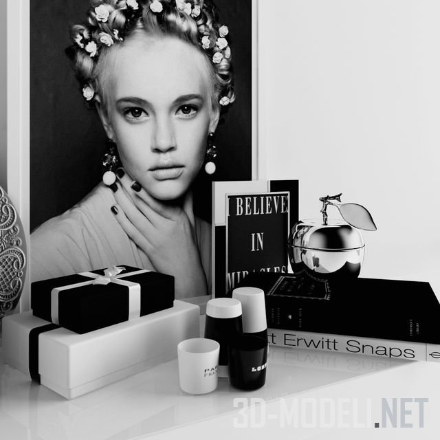 Красивая декоративная композиция, состоящая из небольших круглых подарочных коробочек, книг с лежащим на них золотым яблоком, часов, баночек с косметикой и фирменных бумажных пакетов черного и белого цвета от Chanel. Из белого пакета торчат несколько красных тюльпанов с зелеными листьями. Центральной частью композиции является портрет прекрасной молодой девушки с цветами в прическе.