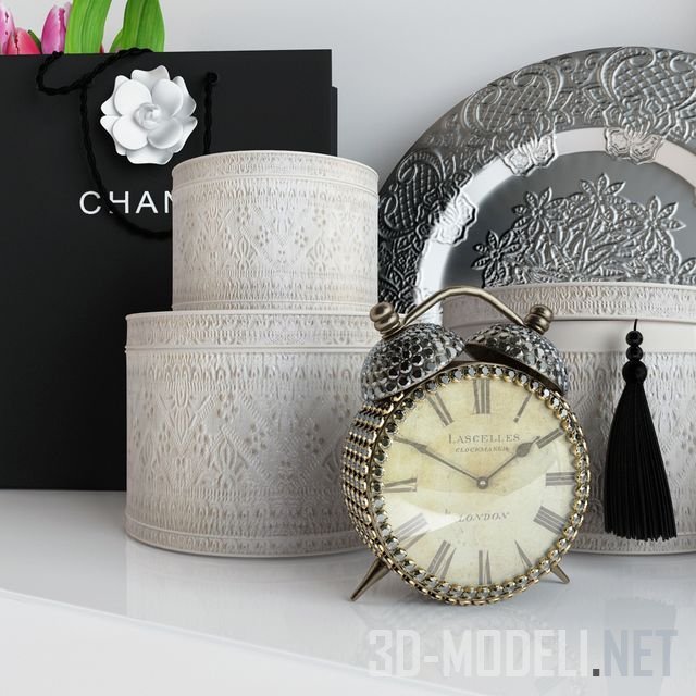 Chanel, тюльпаны, яблоко, коробка, картина, будильник, ваза, свечи, поднос, книга