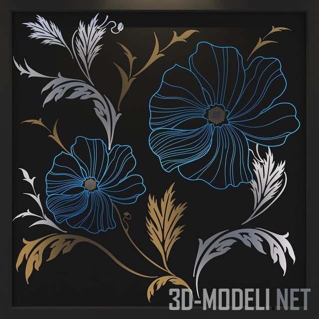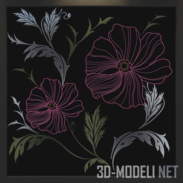 Квадратное настенное панно черного цвета, на котором тонкими цветными линиями прорисованы цветы маков и листья. Интересный вариант для декора интерьера.