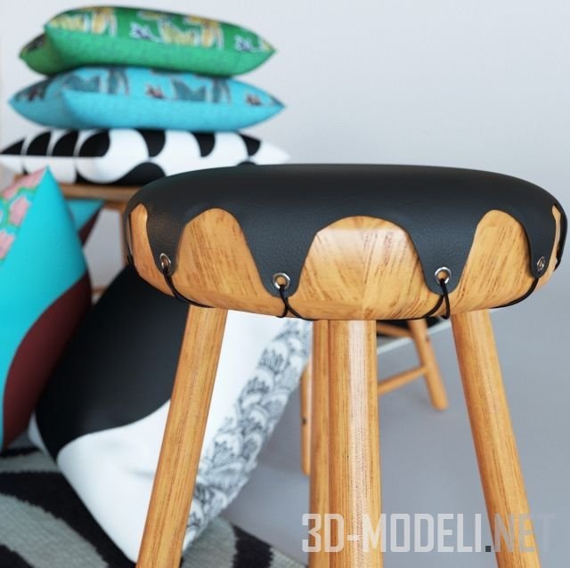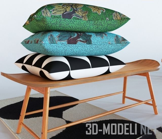 Эклектичный набор текстиля из коллекции Tillfalle в виде подушек с цветными этническими принтами с бразильскими и скандинавскими мотивами. Пара напольных ковриков из жесткой нитки с черно-белыми зебральными разводами, деревянные табуретки с круглыми сиденьями, декорированными черными кожаными накладками и деревянная скамья с подогнутыми кверху краями дополняют коллекцию. Производитель: IKEA.