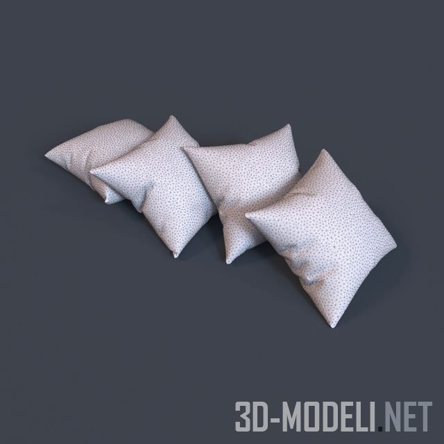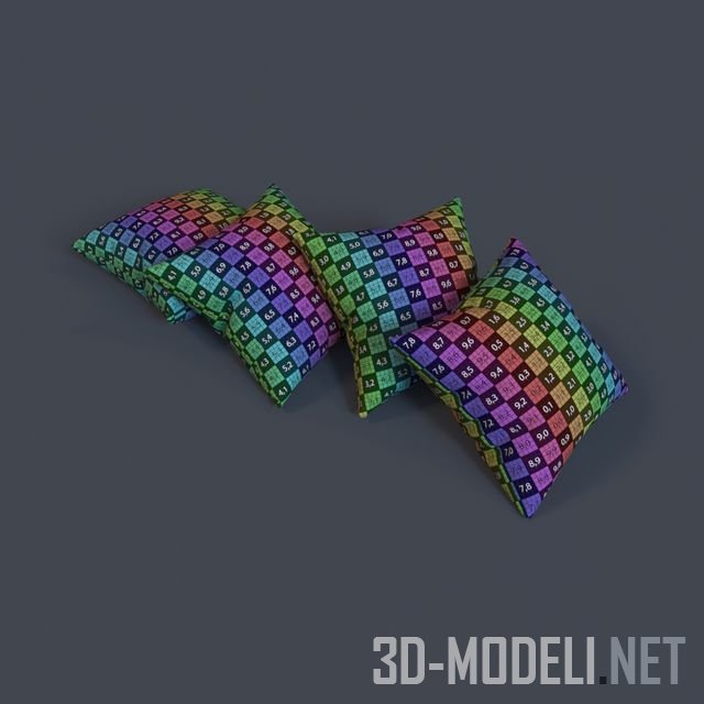 Четыре декоративные подушки в чехлах с пестрыми принтами. На первой подушке - стилизованные осенние листья. На второй - плоды и листья коричневатых тонов на белом фоне. На третьей - зеленые, синие и коричневые рустикальные квадраты на белом фоне. На четвертой - стилизованные листья и цветы садовых растений на бледно-голубом фоне.