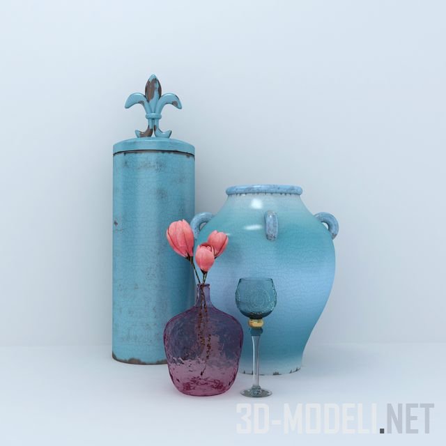 Набор декоративных элементов от Arteva Home, состоит из различных ваз разной конфигурации и цвета, бутылок. В комплекте ваза с тюльпанами, фрукты, панно и другие предметы для декора интерьера.